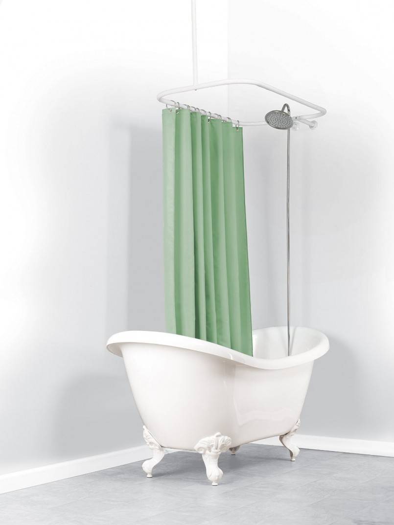 Если резервуары асимметричные и установлены в углу или нише, лучше использовать карнизы в форме дуги, когда изогнутую трубку фиксируют на смежной либо противоположной поверхности. При креплении подобных конструкций к потолку потребуется предусмотреть дополнительную опору у стены.