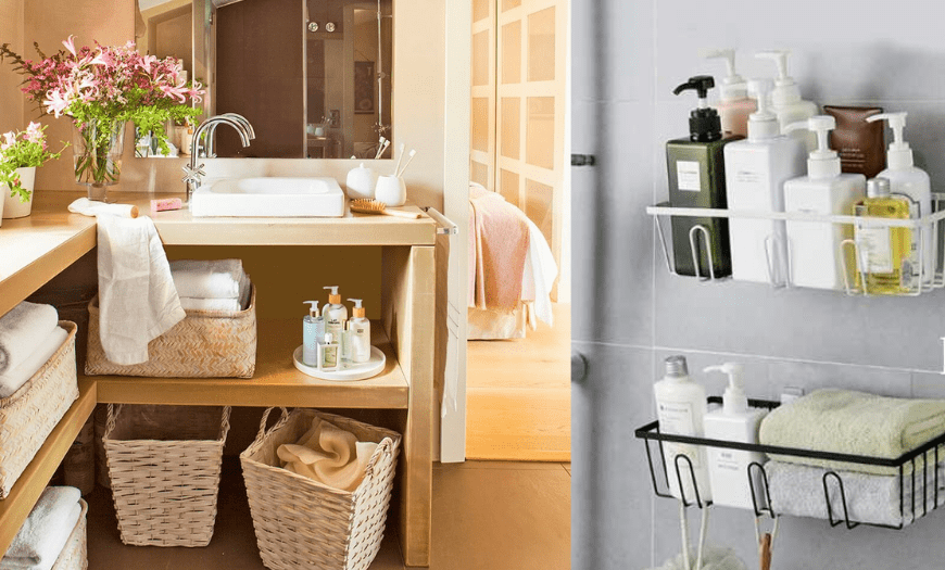 Дизайн ванной комнаты с туалетом: корзины для хранения в интерьере