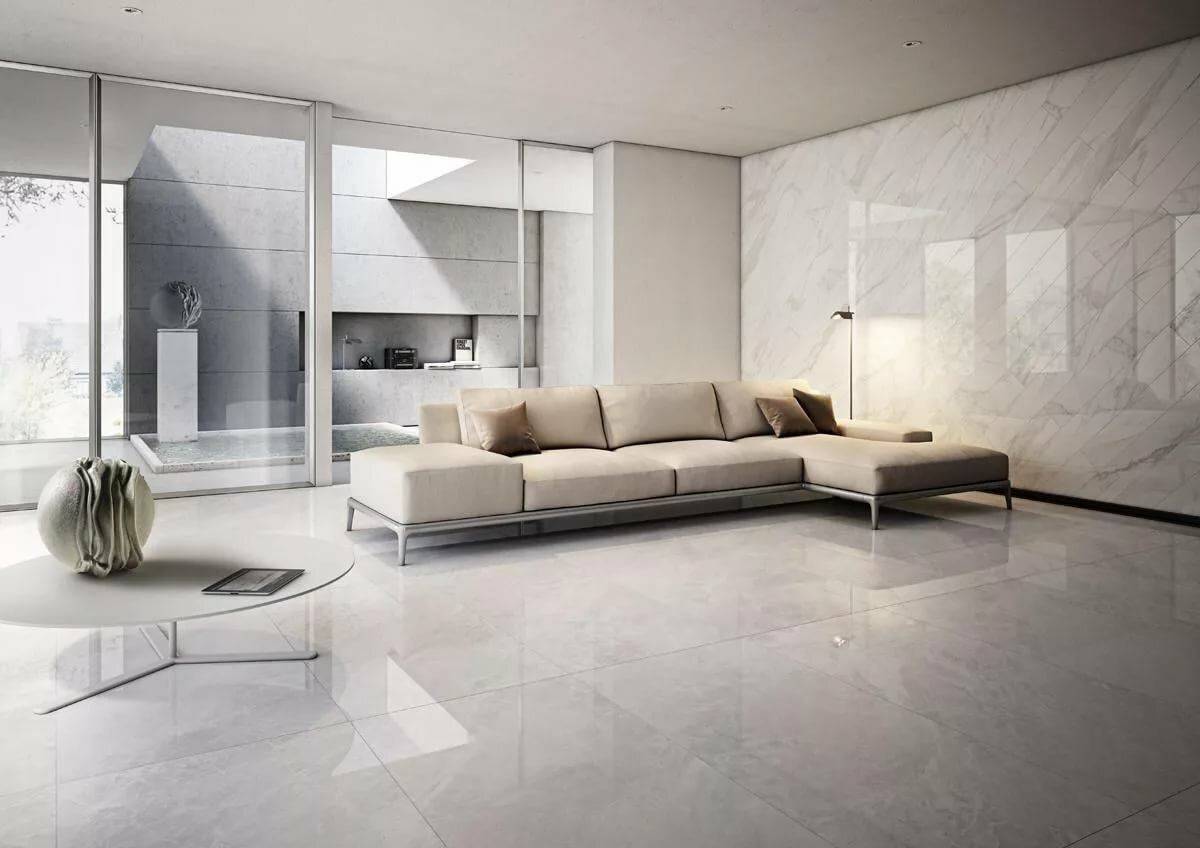 Если вам нравятся блестящие полы, то ни один другой материал не будет так хорош, как полированная керамическая плитка. Блестящая поверхность будет красиво отражать и рассеивать свет, освещая всю комнату. Плиточный пол идеально подходит, когда гостиная соединена с кухней — благодаря плитке пол будет равномерным, оптически соединяющим обе комнаты.