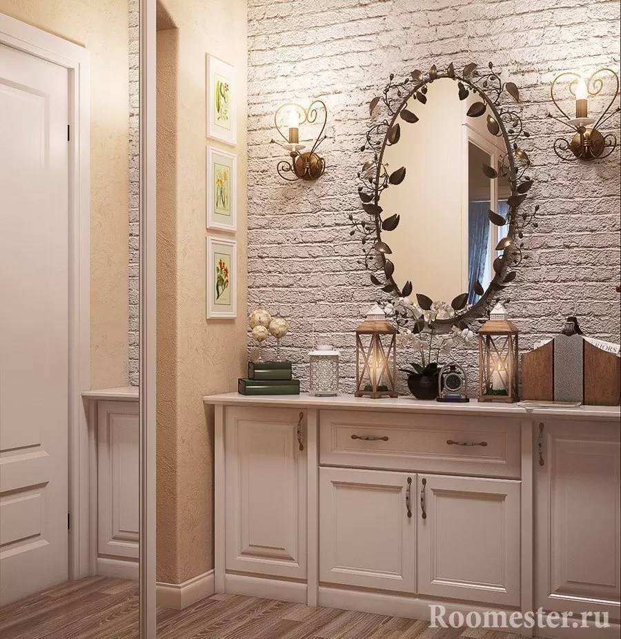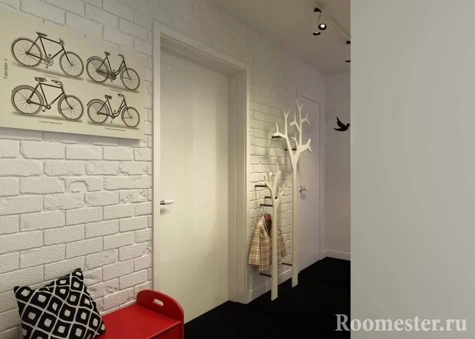 Чтобы холл не выглядел слишком мрачным (основная массе прихожих квартир лишена окон), используйте дополнительное освещение или белый цвет. В качестве бюджетного варианта вместо клинкера примените фактурную штукатурку: повреждения, неизбежные в процессе усиленной эксплуатации, устраняются просто.