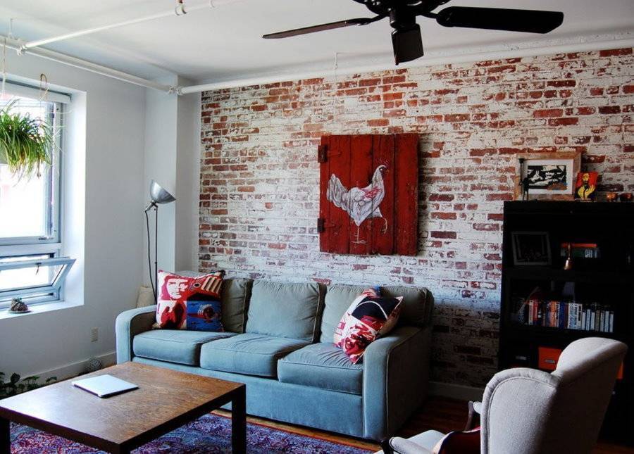 Яркие и смелые личности придут в восторг от кирпичной стены в интерьере в стиле поп-арт или стимпанк. Это подходящий вариант для тех, кто не боится экспериментов с цветами и текстурами. На фоне кирпичной стены прекрасно смотрится вся палитра сочных оттенков. Грубая фактура кладки не только не портит, но даже дополняет мебель в стиле и арт-деко.