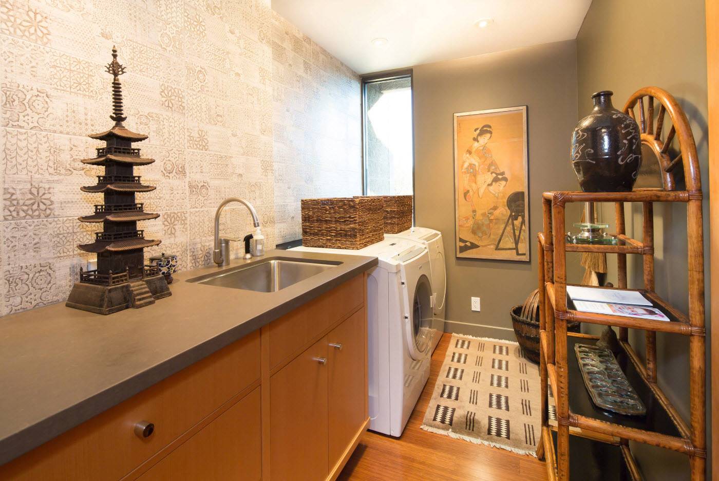 Характерные дополнения в виде статуй Будды и пейзажей на заднем плане не препятствуют восприятию современных элементов декора вроде стены серого цвета.