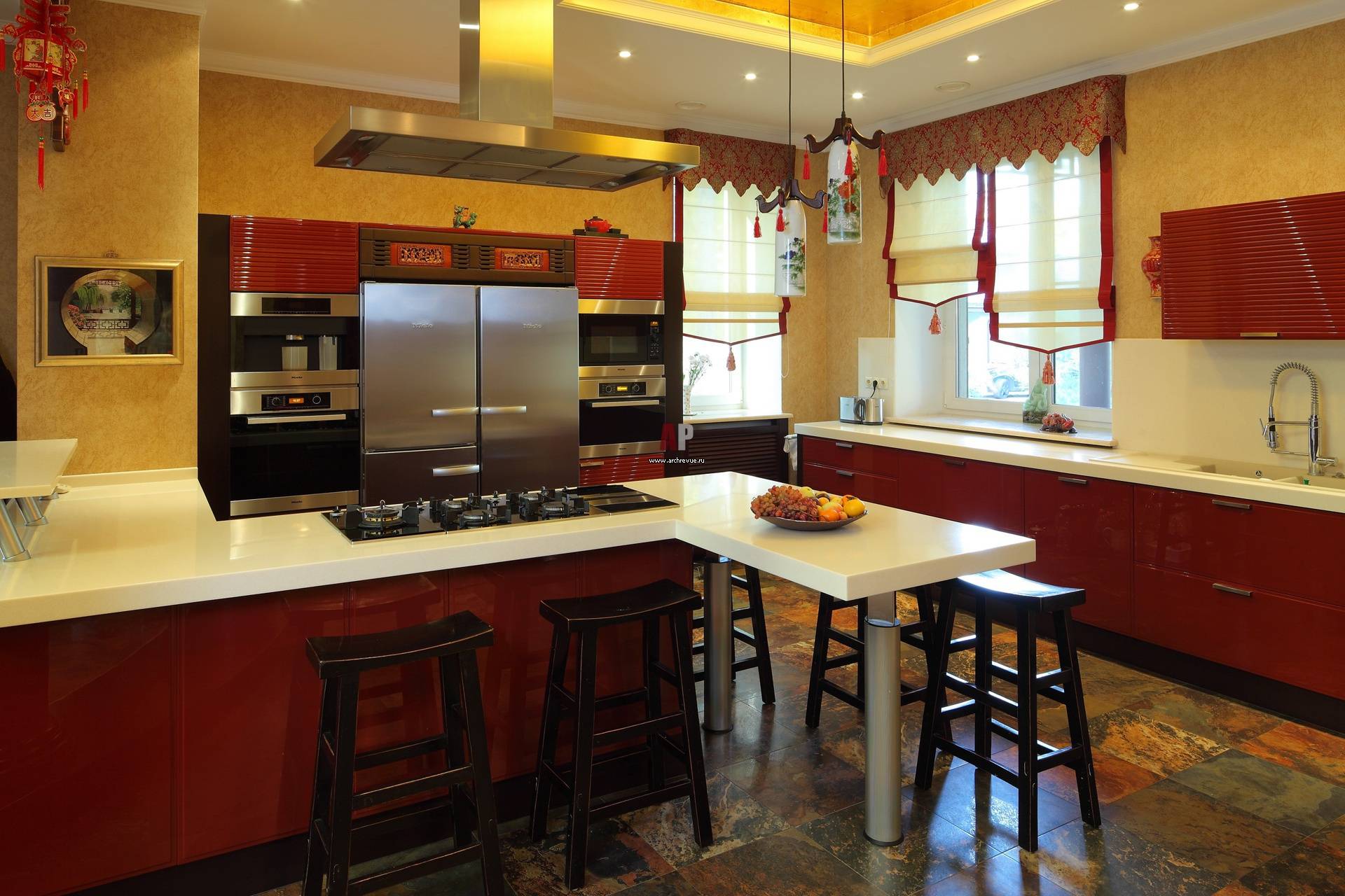 Как уже было сказано, для китайского стиля оформления кухни характерно использование традиционных цветов. Старайтесь выбирать максимально естественные тона. Это могут оттенки красного, желтого, коричневого, бежевого, черного, оливкового. Допустимо использование меди и золота, кремовых, темно-зеленых и оранжевых тонов.