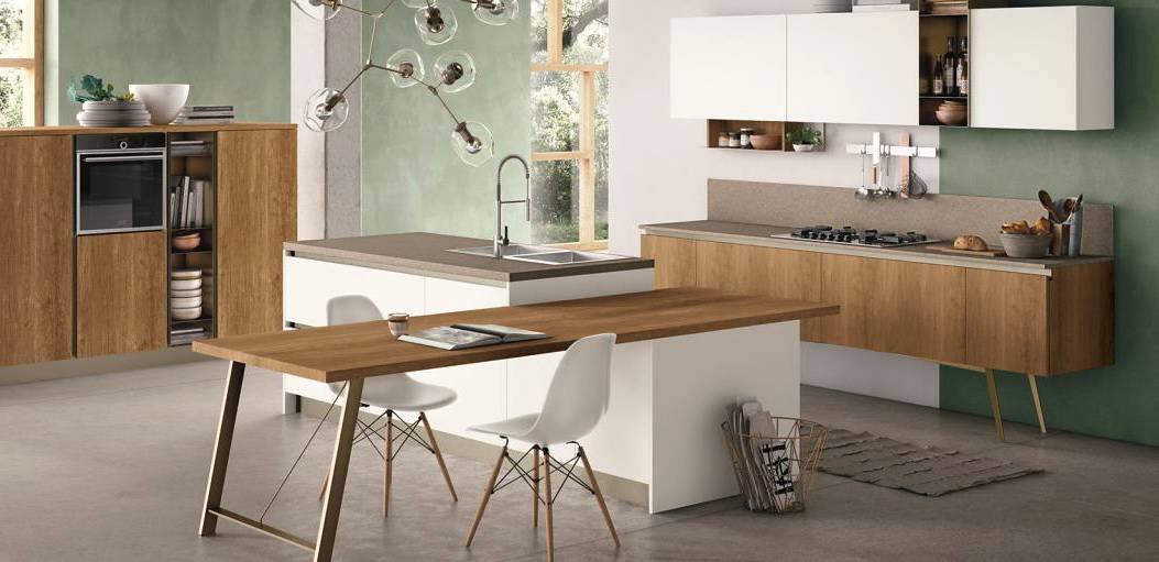 В моду входят деревянные кухни с глянцевыми фасадами. На кухне размещается габаритная бытовая техника ярких цветов, которая выставляется на первый план. Гарнитуры обычно выбирали без навесных шкафов, так как в приоритете было свободное пространство. Мелкую технику (тостеры), ручные приборы (кофемолки, мясорубки), посуду («пузатые» чайники, различная кухонная утварь, яркие кружки и тарелки) намеренно держали на виду как элемент декора.