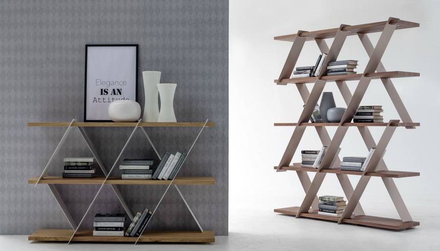 Асимметричные стеллажи усложняют интерьер гостиной, совмещённой с домашним офисом