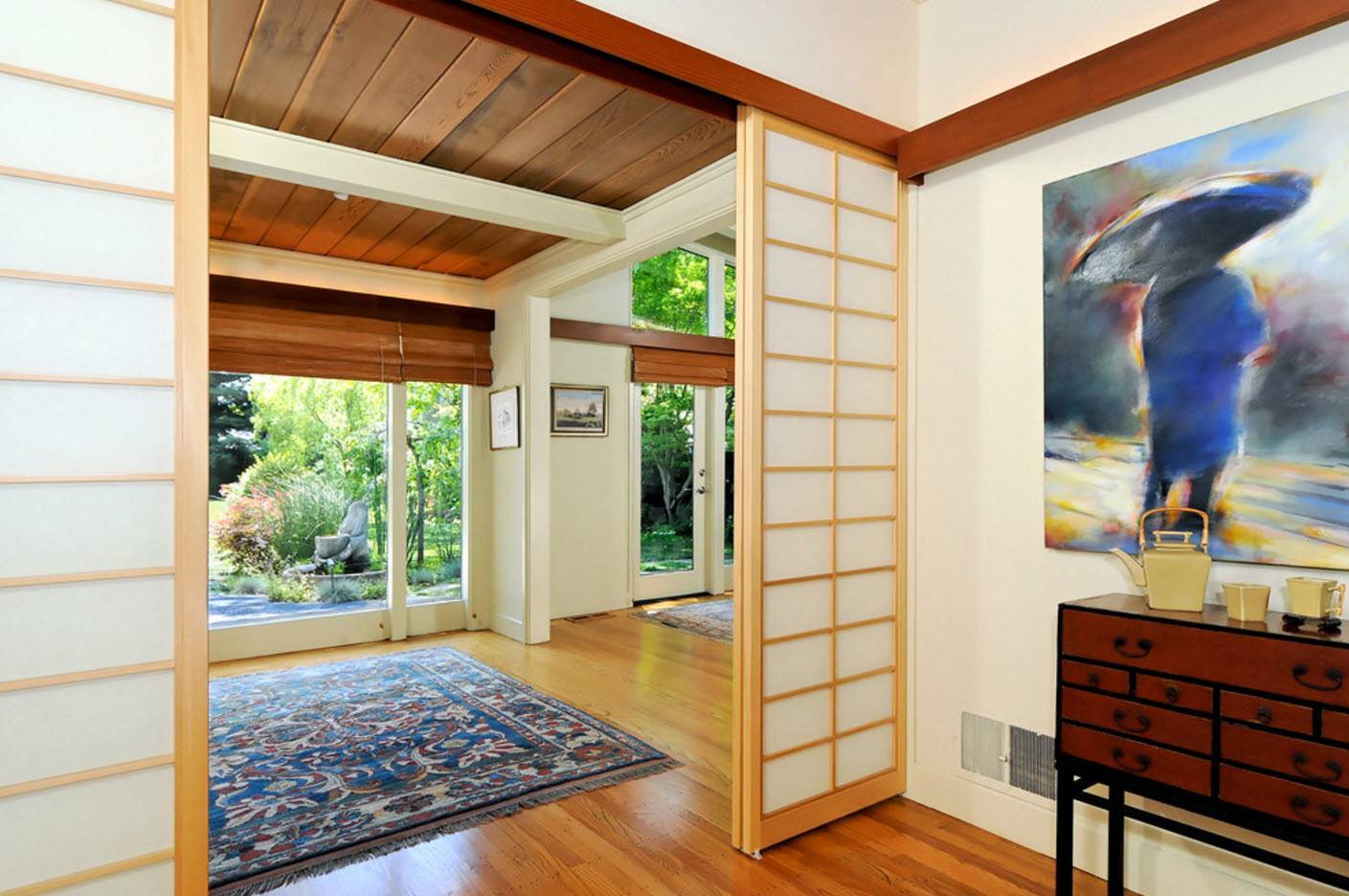 Для зонирования функциональных сегментов часто используются перегородки и ширмы из соломки или рисовой бумаги на деревянном каркасе. Основной механизм межкомнатных дверей — раздвижной (как купе).