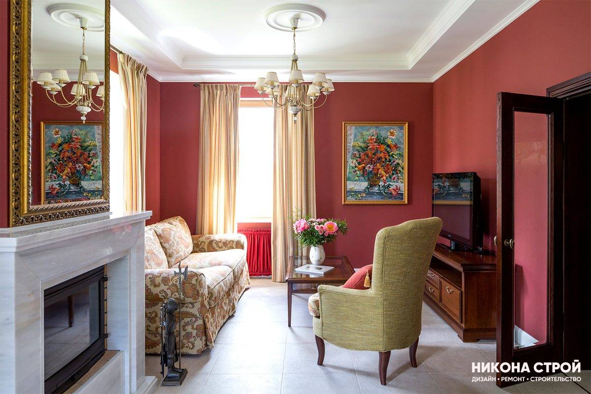 Идейным центром считается камин – сердце дома. Ниже на фото интерьера комнаты в классическом стиле он как раз присутствует. Поскольку редкая квартира может похвастаться дымоходом, альтернативой станет электрический камин – современные модели не только правдоподобно имитируют огонь, но и сопровождают его звуковыми эффектами – уютным потрескиванием дров и приглушенным гулом пламени. Перед ним приятно и книжку почитать, завернувшись в плед, и с гостями поболтать.