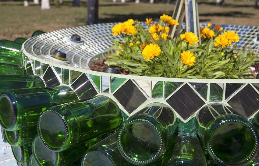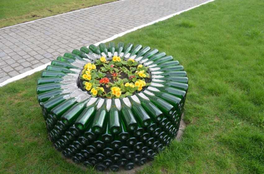 Такой вид клумбы является все доступным и наименее затратным. К оформлению клумбы из бутылок можно подойти достаточно оригинально. Из них получаются интересные фигуры, которые станут украшением вашего участка, или оформить заборчик цветника. Горизонтальная выкладка потребует много терпения, но в результате можно получить интересный вазон под цветы.
