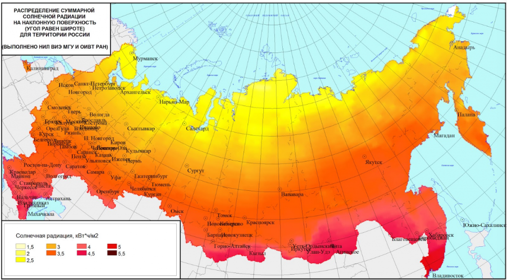 Даже с учетом того, что зимой на большей части России приход солнечной радиации снижается, вложения в солнечную энергосистему продолжает оставаться доходным. Более того, есть регионы, где приход солнечной радиации зимой даже больше, чем летом (например, Дальний Восток). В любом случае, солнечные батареи позволяют экономить на платежах за электроэнергию круглый год.