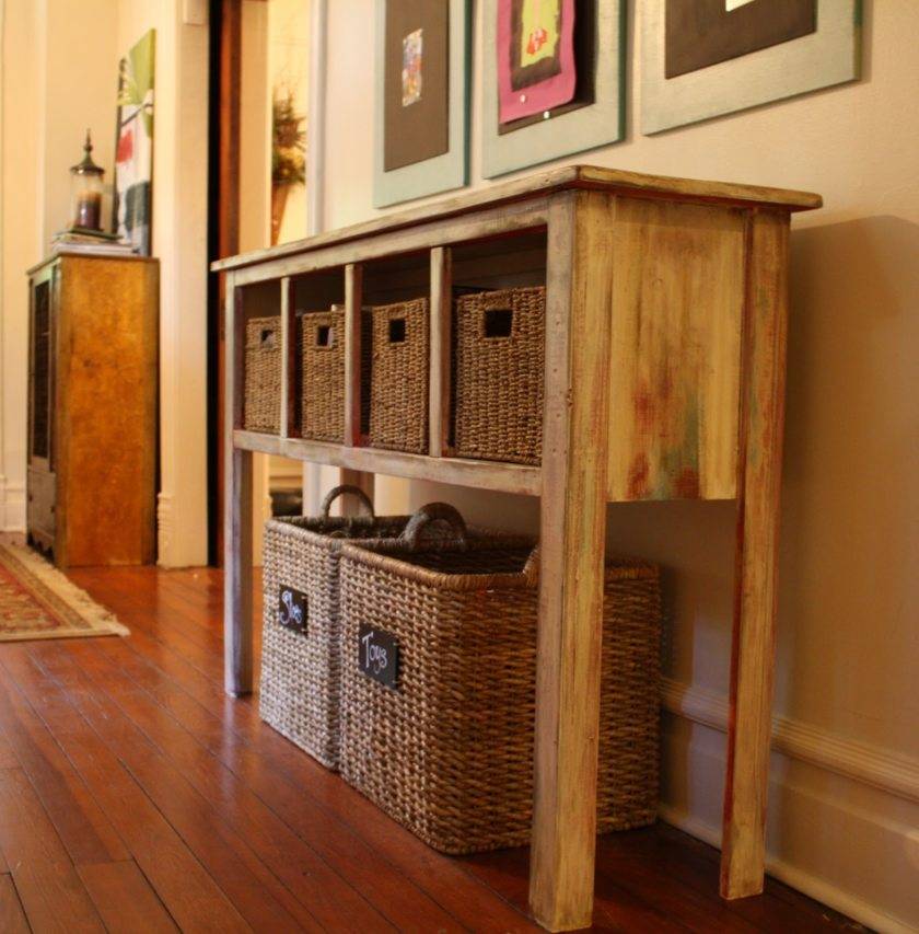 Проще всего для создания консоли использовать старый стол. Для этого конструкция распиливается пополам, зачищается наждачной бумагой, а затем окрашивается и декорируется.