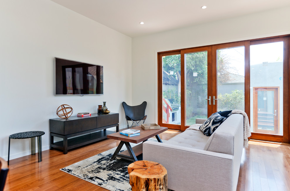 Оптимальным вариантом для гостиной являются плавающие консоли. Такие модели легко поддаются чистке, при желании их положение можно изменить, опустив конструкцию ниже или подняв ее.
