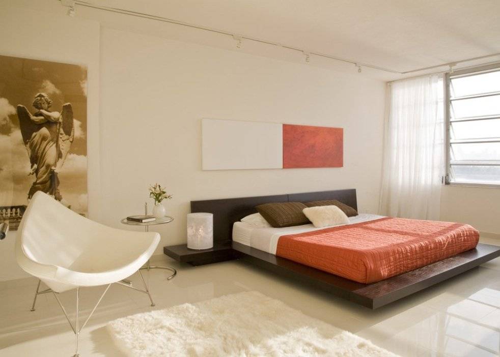 В функциональный «набор» для спальни входят кровать, тумбочки, комод, пара стульев или пуфов и возможно шкаф. Постель выбирают с металлическим каркасом черного или белого цвета. Ее застилают светлым покрывалом: из декора допустимо только две-три однотонных подушки. По бокам кровати симметрично размещают две тумбочки. На каждую устанавливают по светильнику с простым, белым плафоном. Пол перед кроватью застилают небольшим квадратным ковром или двумя маленькими по обе стороны постели. Шкаф можно заменить на конструкцию комбинированного типа с открытыми и закрытыми полками. Этот исключительный шаг допускается только для того, чтобы разбавить атмосферу комнаты отдыха. В открытые полки помещают книги или скудные сувениры, выполненные в лучших традициях минимализма.