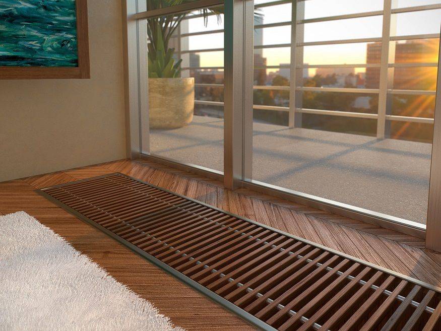 В полу подготавливаются специальные ниши для установки приборов, канала для трубопроводов. Внешний вид таких конвекторов не портит интерьер, так как выглядит просто, как решетки в полу.