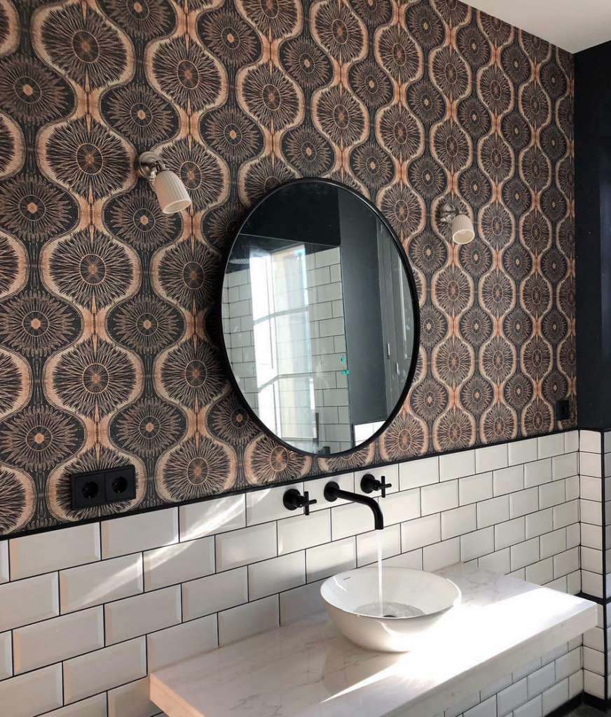 Холодный коричневый (какао) вместе со светлыми виньетками обозначает будуарную классику. Если убрать виньетки и добавить плитку с геометрическим орнаментом, получится сформировать лаконичную современную атмосферу.