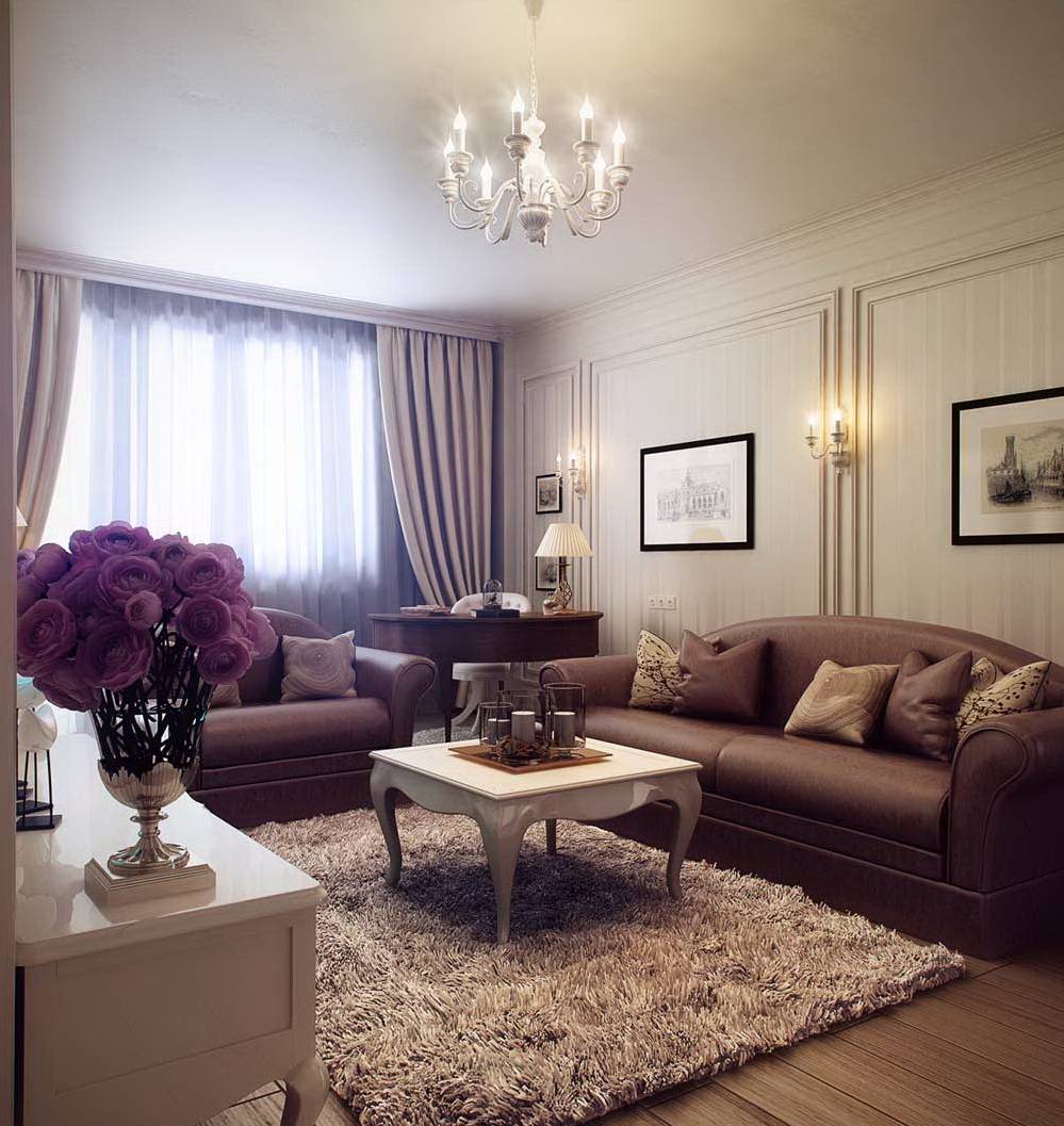 Примеры сочетания коричневого дивана в интерьере гостиной комнаты