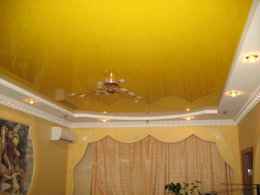 Чаще всего гостиная комната – это самое просторное и многофункциональное помещение в квартире. В оформлении интерьера для нее необязательно ограничиваться одним цветовым решением, вы можете использовать любые оттенки. Если вы решили отдать предпочтение однотонному потолку, учитывайте его соответствие стилю интерьера. Например, для классического направления обычно применяют кремовый, голубой или бежевый оттенки.