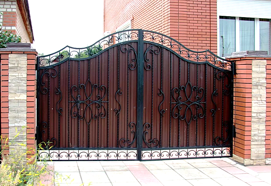 Комбинированные – конструкции из различных материалов, украшенные металлическими коваными элементами. Стоят в несколько раз дешевле. Сочетание материалов зависит от вашей фантазии и потребностей, но самым популярным вариантом считаются ворота из профнастила с элементами ковки.