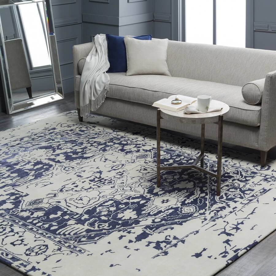 для скандинавского стиля уместны будут ковры белого цвета и всех оттенков синего;