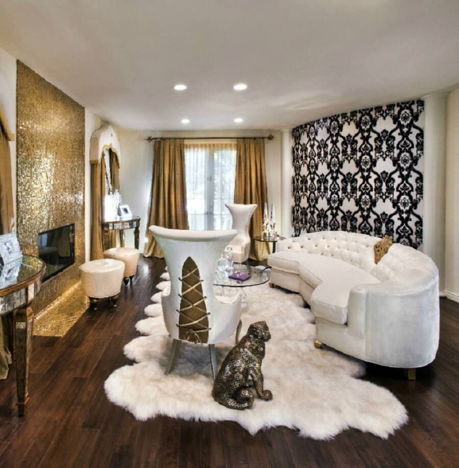 - Круглый. Чтобы ковер на полу не выглядел белой вороной, его форма должна повторяться в других деталях. Круглый стол, плавные очертания кресла, аквариум, люстра.