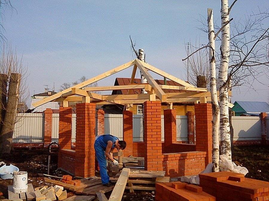 Особое внимание нужно уделять выделению входа: для этого по бокам от него можно выложить аккуратные столбики. Вместе с укладкой стен осуществляется и увеличение кирпичных опор под крышу. По желанию, высота стены может составлять около 1 метра или быть чуть большей, меньшей