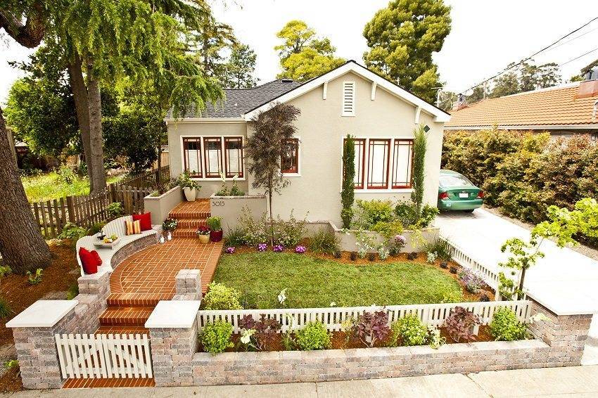 Низкий забор из кирпичной кладки в сочетании с белоснежным штакетником