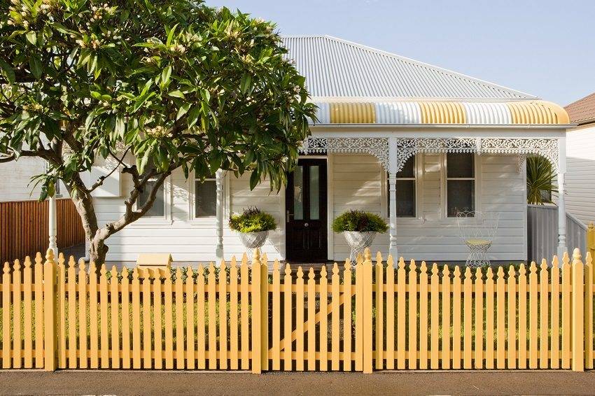 Деревянный штакетник, выкрашенный в желтый цвет, служит источником веселого настроения