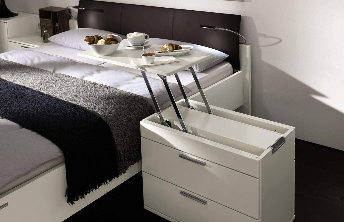 Модели-трансформеры предоставляют дополнительный функционал в виде поднимающегося столика или телевизора. Скрывают предметы, которые используются редко или не вписываются в интерьер. Примеры интерьеров спальни с прикроватными тумбочками показаны в видео.