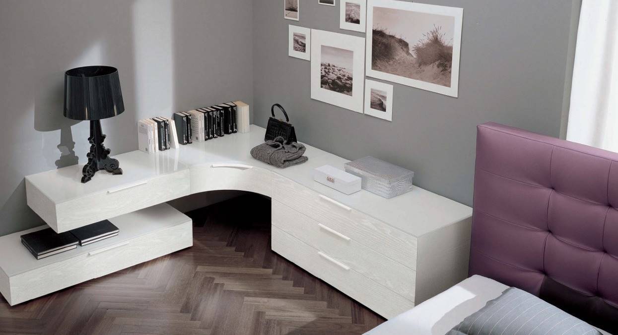 Угловая тумбочка к кровати расширяет полезное пространство и создает дополнительную функциональную зону в спальне. На ней можно разместить украшения или туалетные принадлежности.