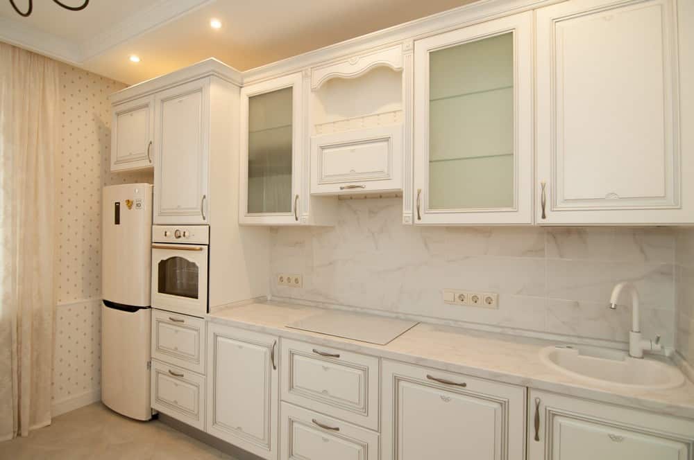 Для популярных сейчас бежевых гарнитуров подойдут бежевый и песочный оттенки, а также белый цвет. Оригинально будут смотреться белые обои с темным рисунком. Неожиданно и ярко выглядят однотонные сиреневые обои на фоне бежевого гарнитура. Допустимы светло-зеленые обои или бордовый цвет (при минимуме декора).
