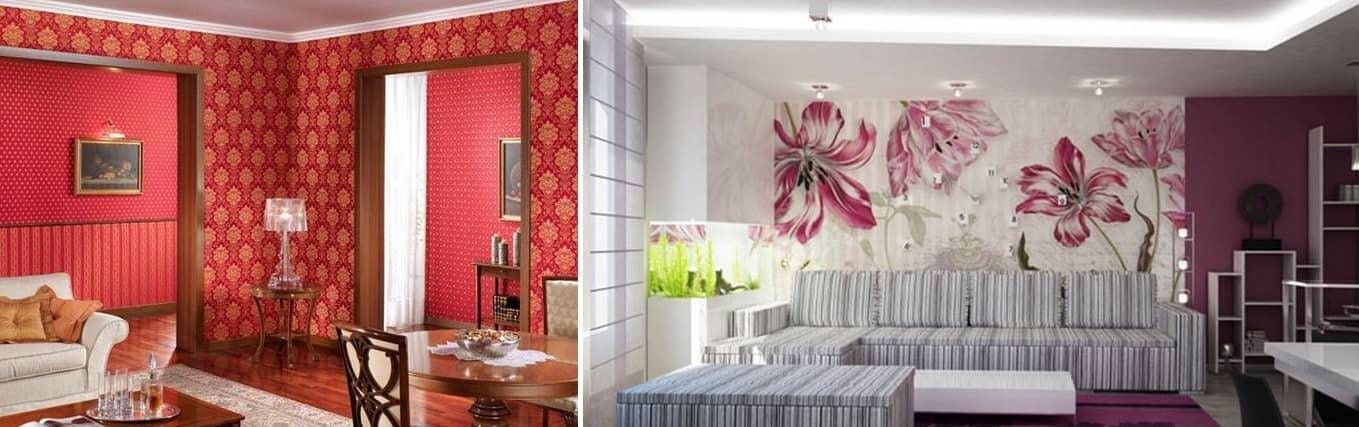 Но срок службы короче, они не поддаются влажной уборке, могут выгореть на свету. Как вариант, можно использовать при комбинациях с другими видами обоев в наиболее безопасных участках зала, либо использовать как дополнительные небольшие вставки, или же использовать этот вариант под дальнейшую покраску.