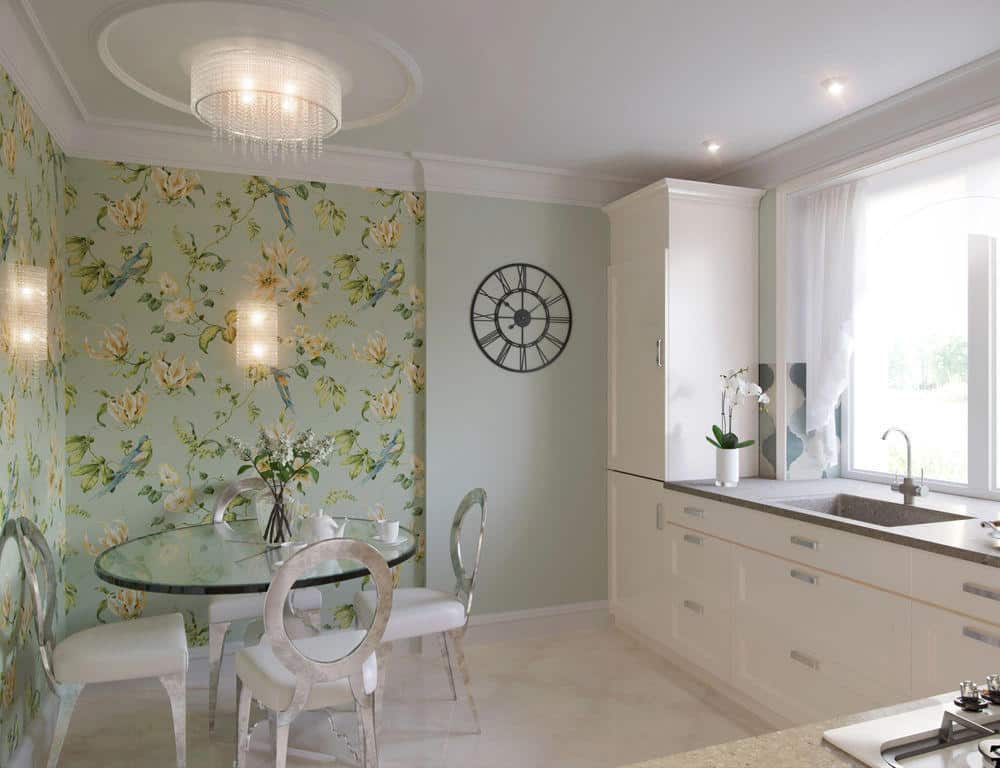 Наиболее распространенный способ, чтоб выделить обеденную зону – это использования отличительных обоев. Это яркие и необычные оттенки настенного покрытия, использования цветочных мотивов, геометрических узоров, имитация природных материалов.