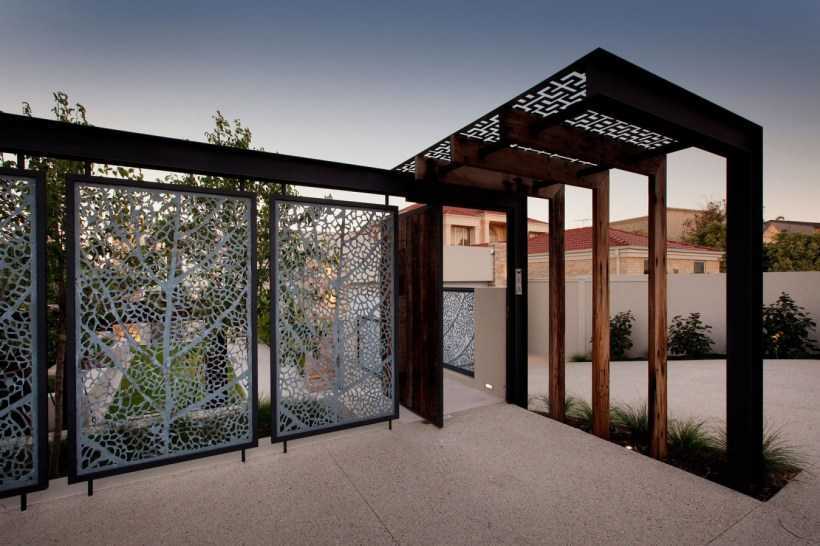 Оригинальный и стильный забор из дерева для загородного дома удается получить, комбинируя деревянные элементы с пергонами или габионами.
