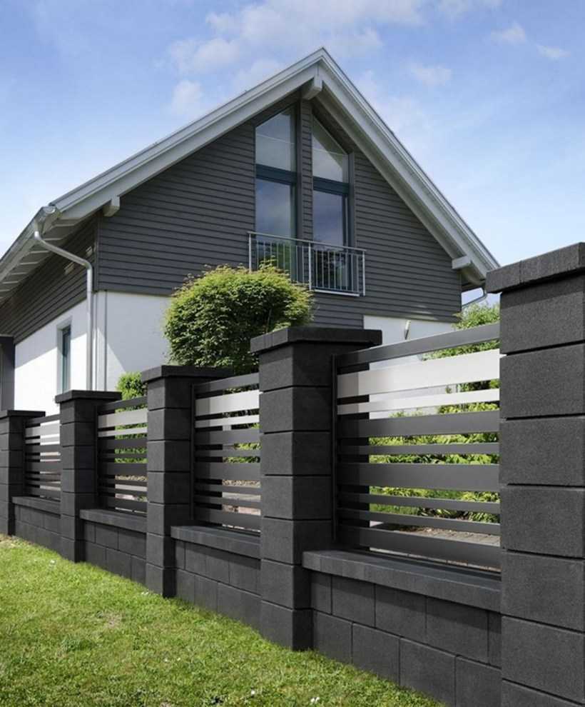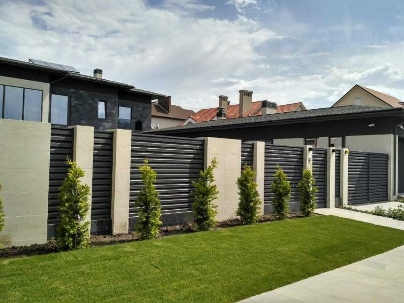 Бетонное основание и железная ограда в одном заборе позволяют сочетать оба признака: они высокие, но при этом позволяют открыть красоту участка и дома на обозрение проходящих людей.