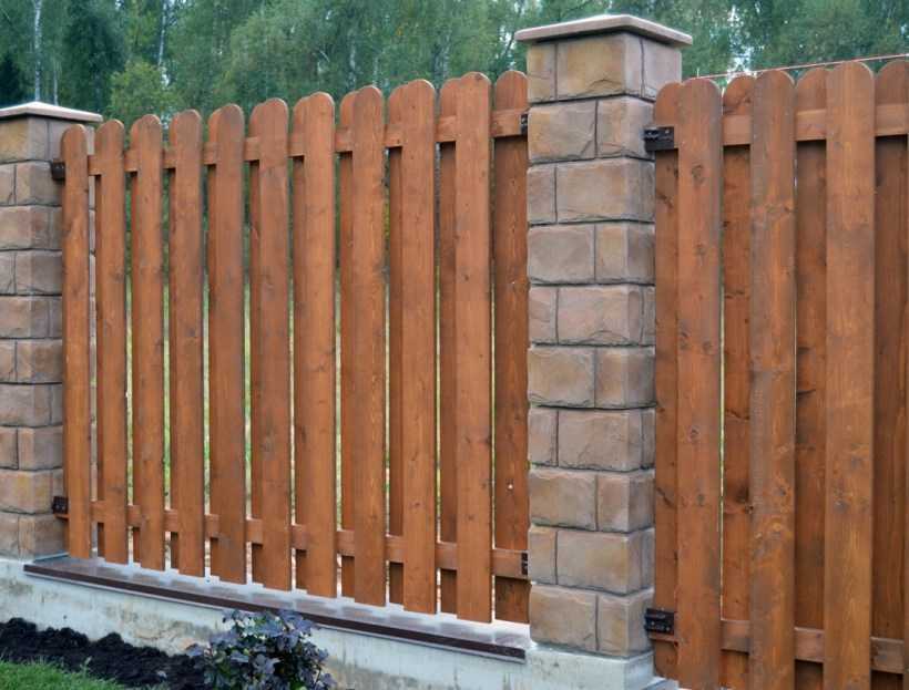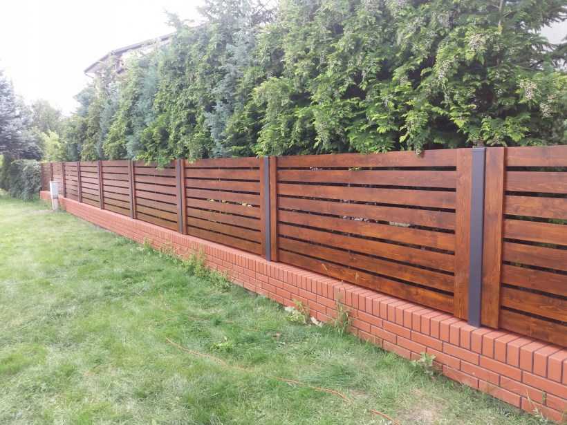 Престижно смотрятся заборы из деревянных конструкций, заключенных между кирпичными или каменными столбами. Превосходно оттеняют натуральную элегантность древесины кованые или литые металлические элементы.