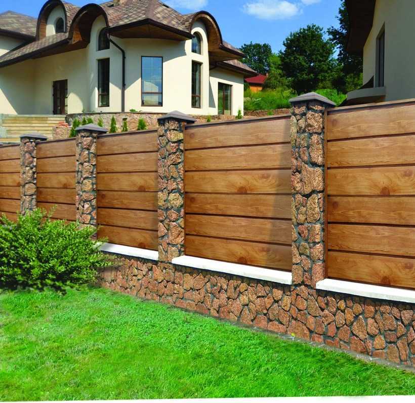 Если владелец частного дома ограничен в средствах, можно рассмотреть дешевый вариант исполнения ограждения из пластика, который по качеству не будет уступать кирпичному. Это надежная защита от лишних взглядов. Благодаря металлическому каркасу, конструкция отличается прочностью.