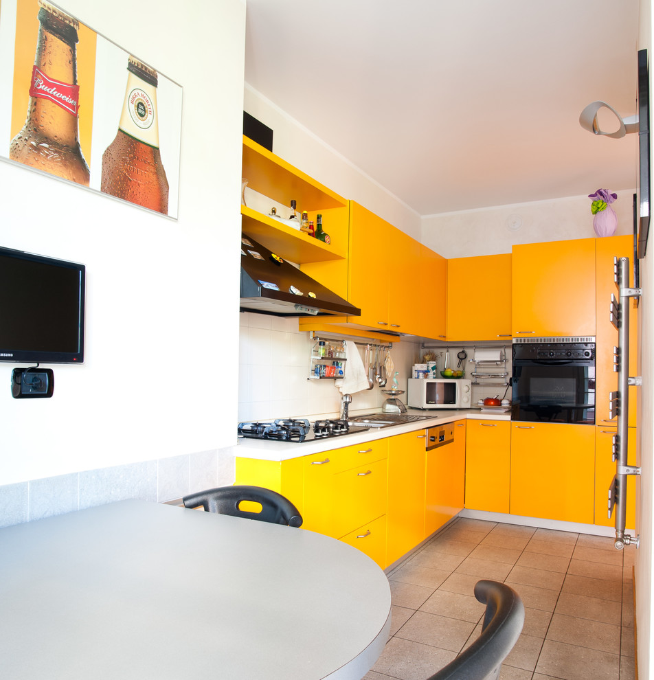 В углу серой студийной комнаты размещён ярко-оранжевый кухонный гарнитур