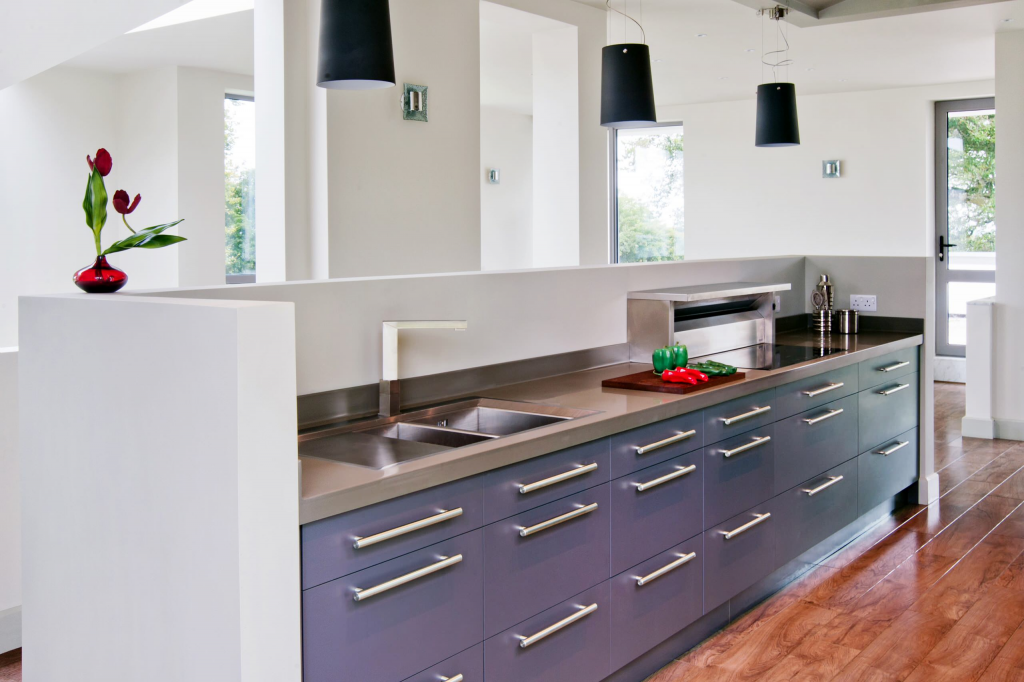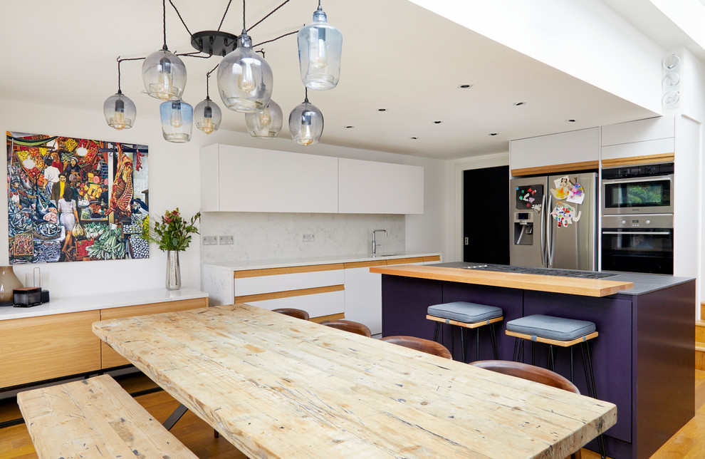 - Фиолетовый встречается в кухнях ретро, эклектика, авангард. Это смелое решение для тех, кто любит яркие акценты в интерьере. Как и синий, фиолетовый практичен, не доставляет хлопот в уходе.