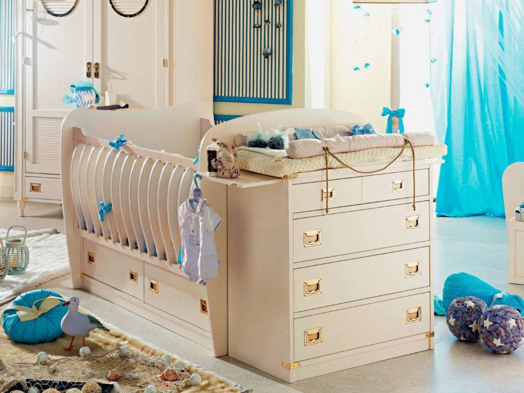 - конструкции комплектуются пеленальным столиком, который совмещен прямо с кроватью. Это достаточно удобно, потому что ребенка не придется относить далеко от кровати, все будет под рукой;