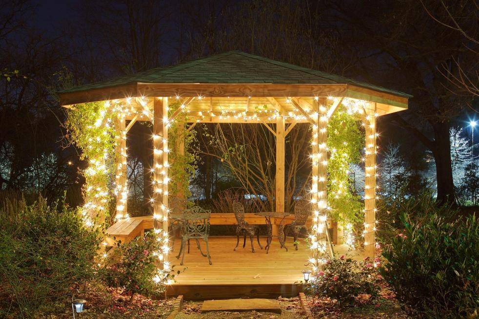 Освещение лучше предусмотреть еще на этапе строительства павильона. Ведь никто не захочет сидеть в беседке в полной темноте, а отдых часто продолжается уже после того, как садится солнце. Для проведения света потребуется минимум усилий. Можно установить светильники наверху или по бокам, но их должно быть достаточно для того, чтобы глаза не уставали от полумрака.