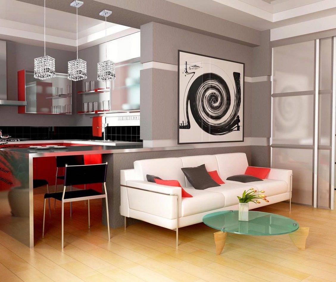 Современная гостиная с мини-кухней — хорошая идея для небольших интерьеров. Сочетание гостиной и кухни оптически расширяет интерьер. Такая комната может быть организована разными способами.
