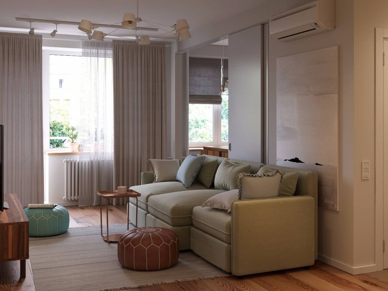 Удачное решение оформления интерьера совмещенного пространства хрущевки представлено на фото: