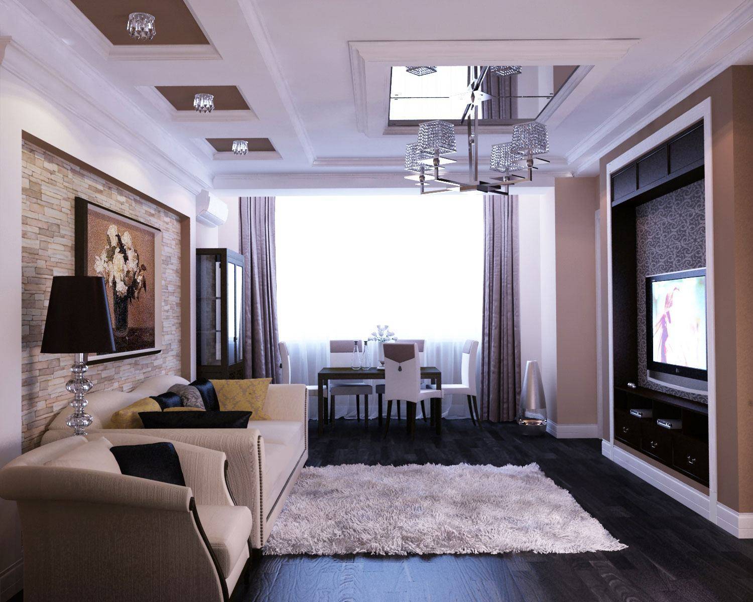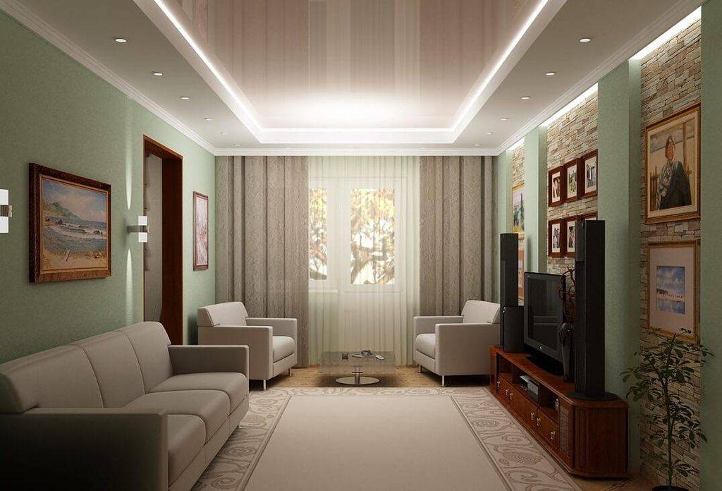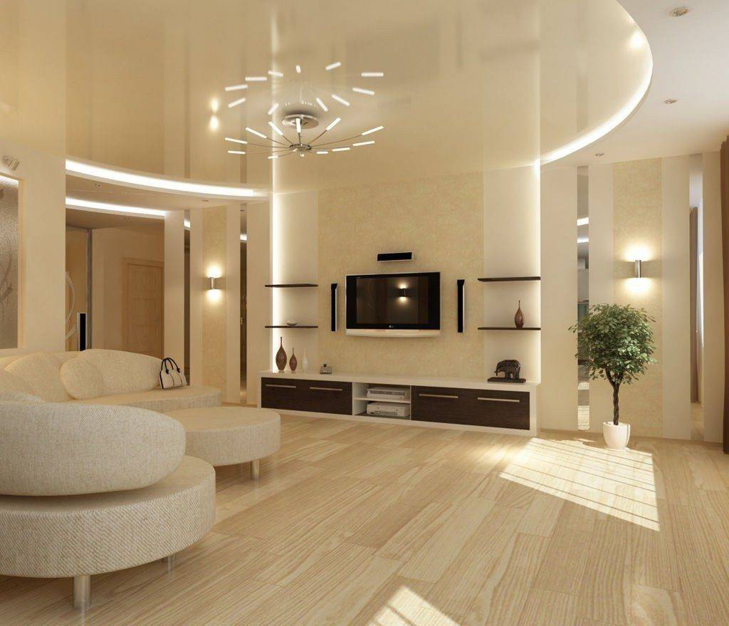 Начнем с трудоемких способов. Многоярусный потолок – прекрасная возможность выделить зону отдыха гостиной. Подвесные конструкции дают неограниченный простор для фантазии. В дизайне лучше отказаться от простых прямоугольных линий и придумать интересную конфигурацию с изогнутыми очертаниями.