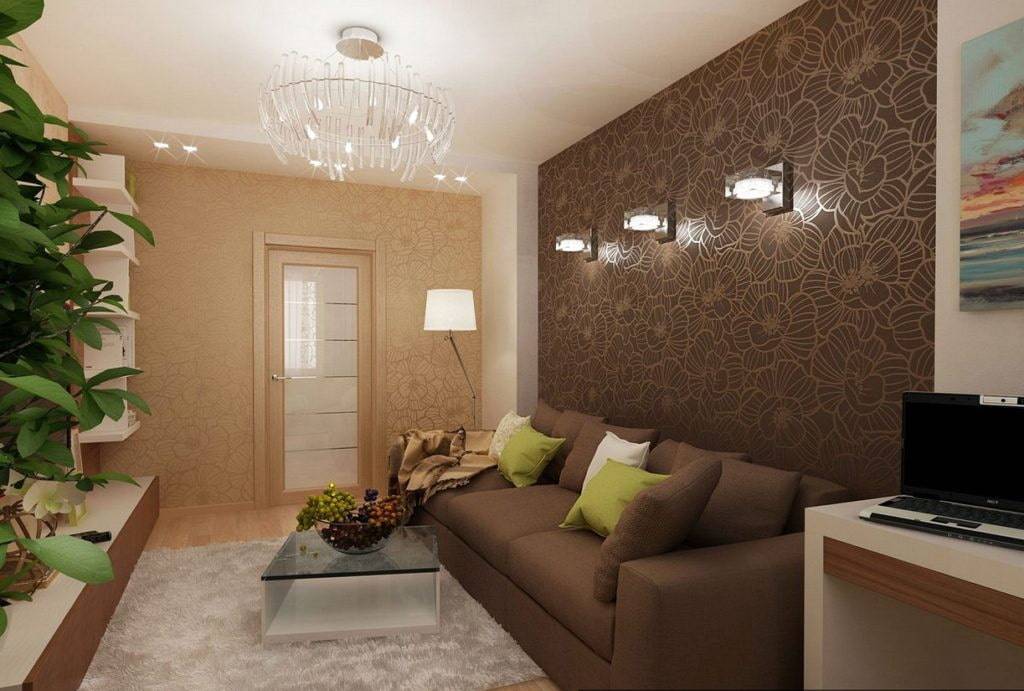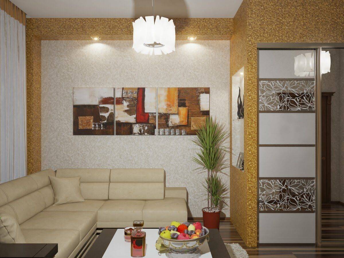 Обычно для оформления стен совмещенной гостиной хрущевки применяют декоративную штукатурку, обои или окрашивание современными ЛКМ. Заслуживает внимания и дизайн переходного участка комбинирования.