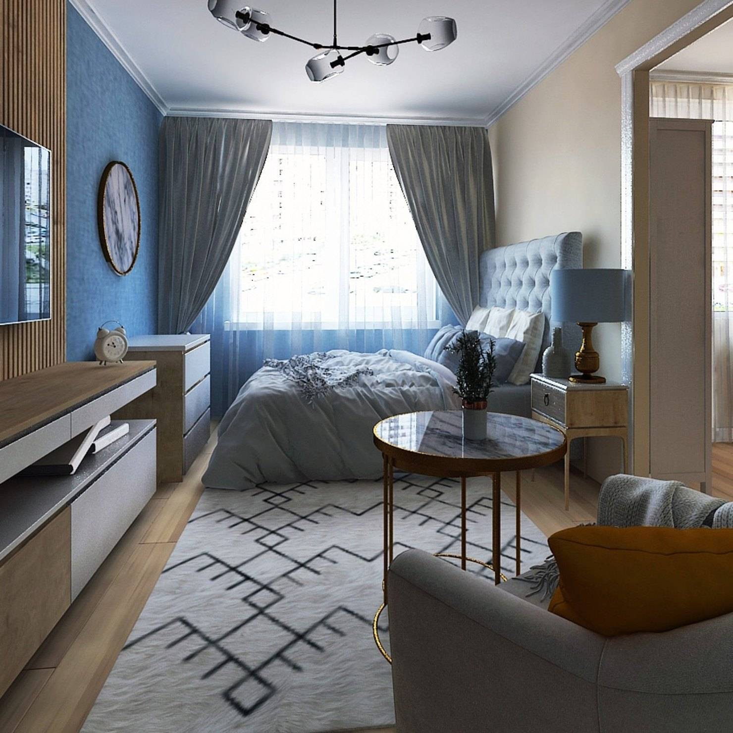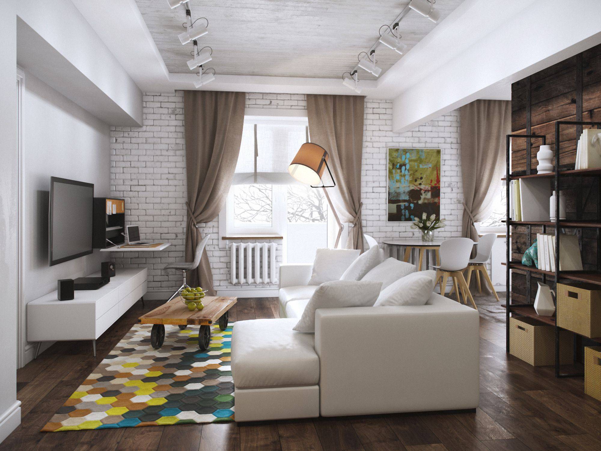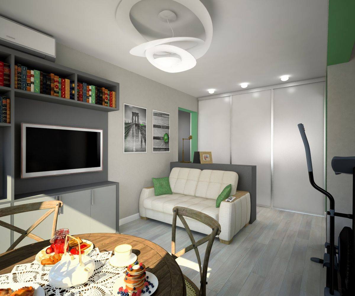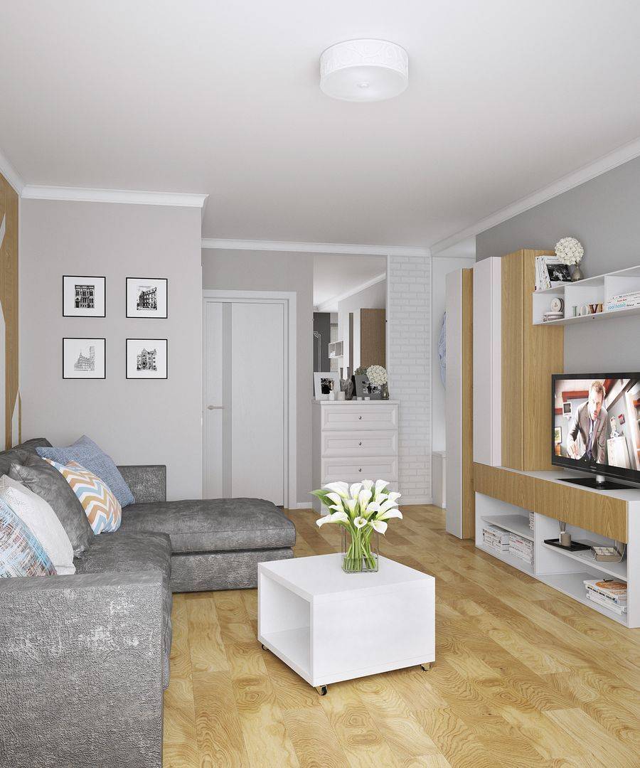 Маленькая квартира в хрущевке — отличный проект! Уникальная небольшая площадь в нейтральных белых тонах в сочетании с серыми, прохладными синими оттенками и бирюзы. Вы будете очарованы изумительным решением такой небольшой площади — точно продуманной и вдобавок чрезвычайно приятной. Оказывается, не только белый цвет осветляет и расширяет маленькие интерьеры, вам не нужно более насыщенных оттенков, а тона сине-стальной стали хорошо сочетаются в небольших помещениях. Минималистичные украшения и детали с оттенком причудливой плитки на стене и на полу в кухне разнообразят маленькую совмещенную комнату. Телевизионный уголок можно организовать на замечательном комоде с оттенком индустриального стиля. Очарование деталей и отличная функциональность в сочетании с ними — немного удивительно, где вы не почувствуете замкнутого пространства. Обращение с белым, серым и блеклым поочередно оказывает успокаивающее влияние на глаза. Детали в стиле скандинавского минимализма с оттенком индустриальности и современности просто и тонко смешаны.
