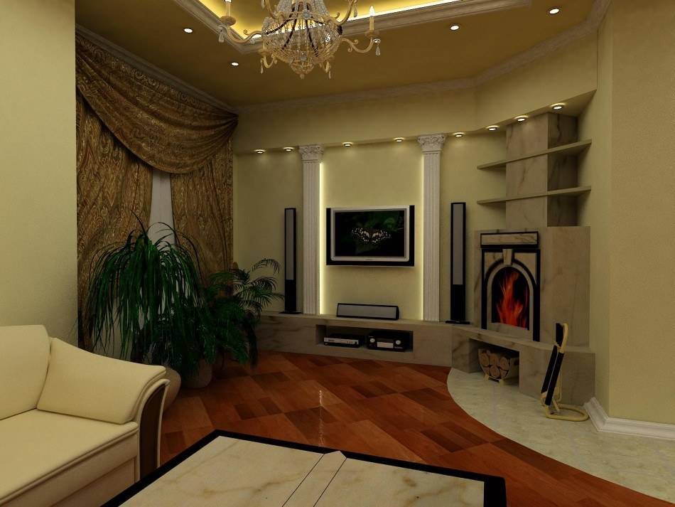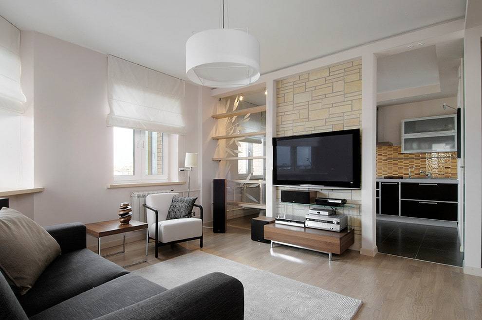 - На границе зала с кухонной зоной можно соорудить арку или фальш-стену. На такой устойчивой вертикальной конструкции позже размещают настенный телевизор или колонки, семейные снимки и картины.