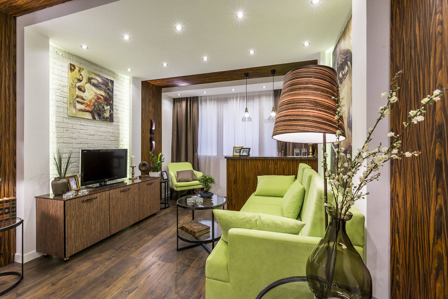 Усилить эффект зонирования призваны точечные светильники по краям, дополненные подвесными моделями в центральной части гостиной.