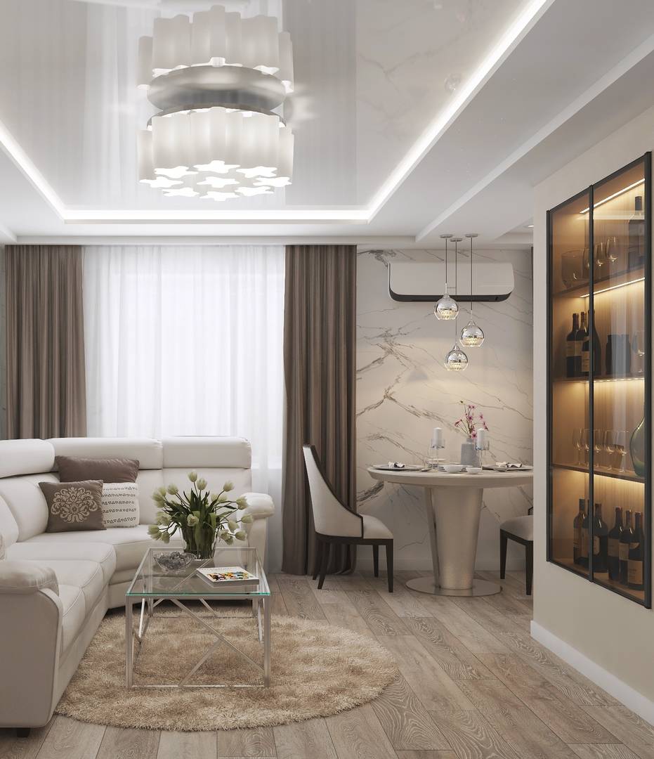 - Расположение обеденной зоны рядом с кухней, дающее возможно увеличить гостиную зону.