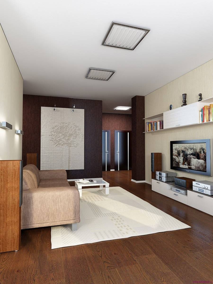 Половое покрытие гостиной в хрущевке обычно представлено практичной ламинированной доской. В зависимости от дизайна интерьера, можно остановиться на паркете или ковролине.