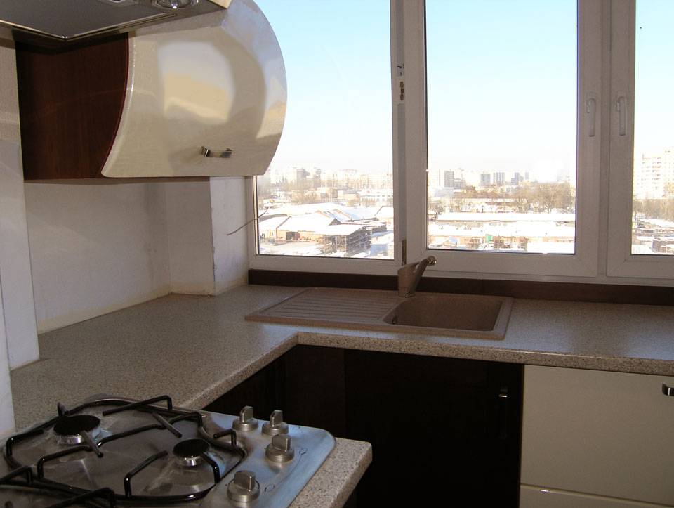 Переделка балкона под кухню, удобное открытие окна для проветривания. При правильной планировке уместится и обеденная зона.
