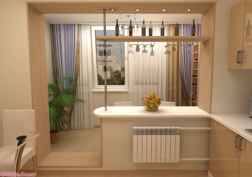 Дополнительное пространство балкона станет отличным местом для холодильника, а перегородка в виде стола или барной стойки прекрасно заменит объёмный обеденный стол и освободит пространство для уютного небольшого диванчика.